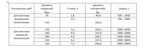 Канализационните тръби, представени в Таблица 2 за монтаж на вътрешни системи, са изработени със сива повърхност, за външни комуникации са боядисани в червено.