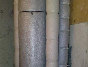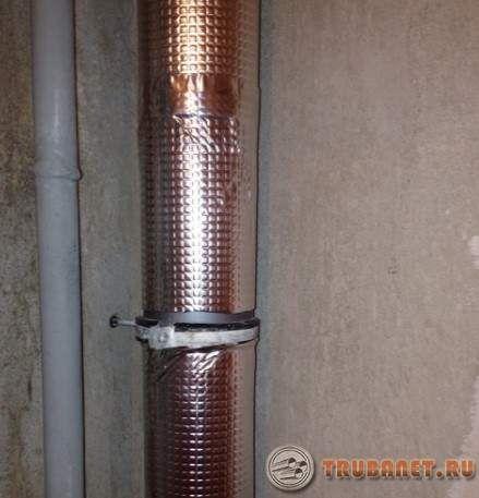 - Най-често за такава работа използват разпенен полиетилен, който не само осигурява отлична звукоизолация, но и се отличава с високи топлоизолационни свойства. Освен това, предотвратява кондензацията по тръбите, предотвратявайки развитието на мухъл и плесен.