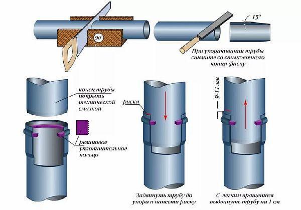 - Уплътняване. За тръбопровод с гравитационен поток това се осигурява чрез муфно свързване на елементите с помощта на гумен маншет за уплътняване.