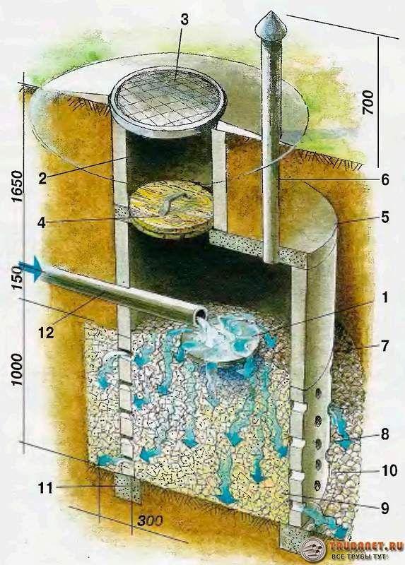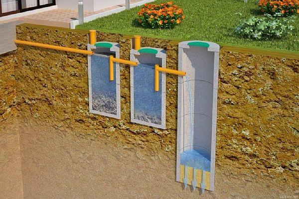 - Филтърни кладенци или септични ями. Първите са най-лесни за изграждане и експлоатация. Те се състоят от изкопана яма с дълбочина до три метра. Напречното сечение може да бъде до два метра, независимо от формата ѝ. Стените на ямата са подсилени с бетон или тухлена зидария. Те могат да бъдат плътни или перфорирани с отвори 40-60 милиметра. На дъното на кладенеца се монтира филтър с дебелина до 80 сантиметра.