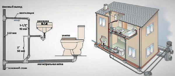 За да се инсталира канализационна система в частен дом, е необходимо да се монтира централен щранг, използващ тръба с диаметър 110 мм. За да може газовете да излизат, щрангът е разположен така, че горната му част да се простира над покрива на къщата.