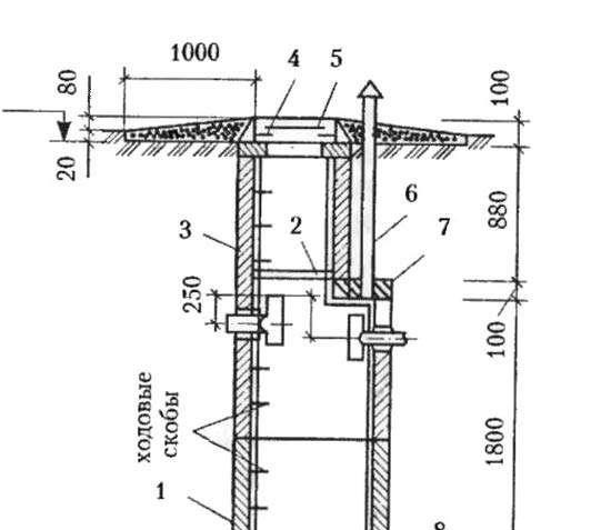 1 – бетонна заготовка с ширина до 1 метър; 2 – дървен под; 3 – бетонна заготовка с ширина до 0,7 метра; 4 – горен отвор; 5 – капак; 6 – вентилационна тръба; 7 – преграда; 8 – бетонно дъно; 9 – изравняващ слой от циментово-пясъчен разтвор.