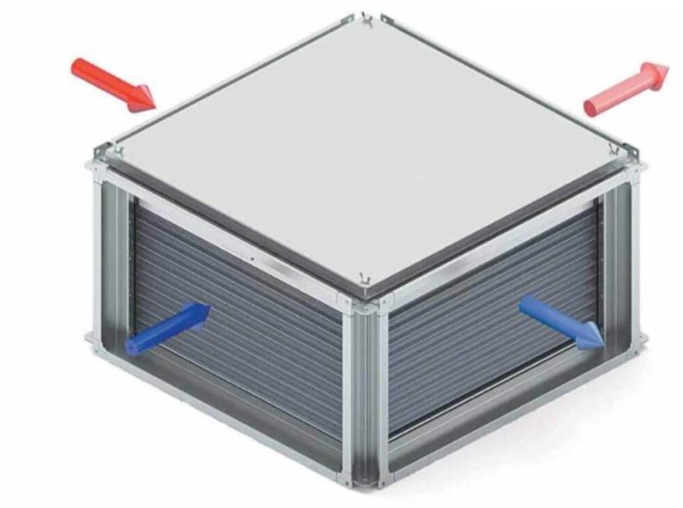 Топлообменникът е сглобен от голям брой камери, където преградите са изработени от топлопроводящи плочи. Моделът на потока се нарича кръстосан поток, защото входящият и изходящият поток са насочени един към друг. Различните страни на преградите се нагряват и охлаждат едновременно.