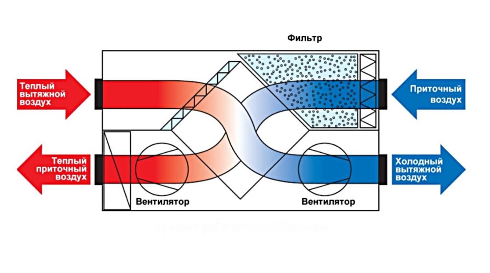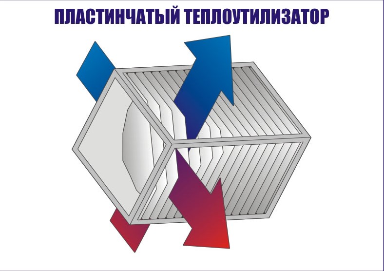 - Подавания въздух навлиза в помещението през съседната камера на топлообменника. Въздушният поток абсорбира топлинната енергия на отработените въздушни маси, но не е напълно или частично (в зависимост от конструкцията) замърсен с примеси поради липсата на директен контакт.