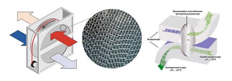 Конструкцията представлява цилиндър, запълнен с гофрирани метални листове. Между слоевете пълнеж са оформени отделения, които получават студен и топъл въздух, докато роторът се върти. С увеличаване на скоростта се увеличава и ефективността на топлообменника.