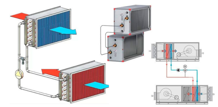 Топлообменникът се нарича още „свързан“ или „гликолов“ топлообменник. Уредът е получил предишното си име поради сложния си дизайн. Рекуператорът съдържа модул с два топлообменника – един за подавания въздух и един за отработения въздух. Между тях циркулира гликолова смес, която пренася топлинна енергия от отработения въздух към входящия въздух.