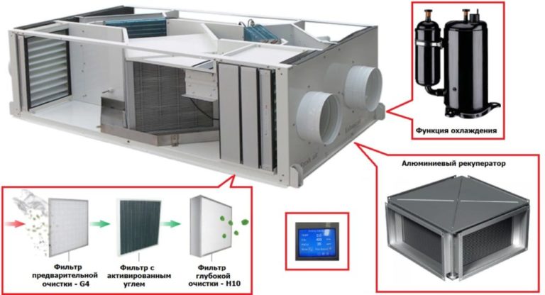 - Методите и оборудването за климатизация са по-скромни. Модулна система, състояща се от няколко устройства, може да обработва ограничен обем въздушни маси, постигайки санитарни и хигиенни параметри в съответствие с установените стандарти. Приточната и изпускателната вентилация разполага с неограничени средства и методи.