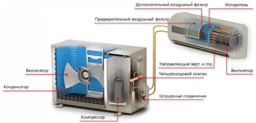 - През зимата, в режим на отопление, топлинната енергия от външното тяло се прехвърля към вътрешния модул. След това загрятият въздух се вкарва в помещението чрез вентилатор.