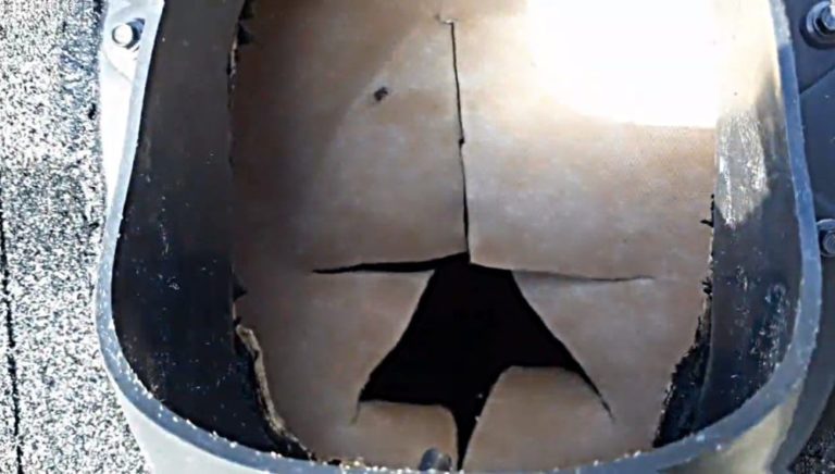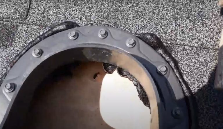 - Отстранете корпуса на въздуховода. Отдолу има гумено уплътнение. Освен това, уплътнете уплътнението по периметъра с битумен уплътнител. Нанесете пастата по периметъра на отвора, изрязан в покрива.
