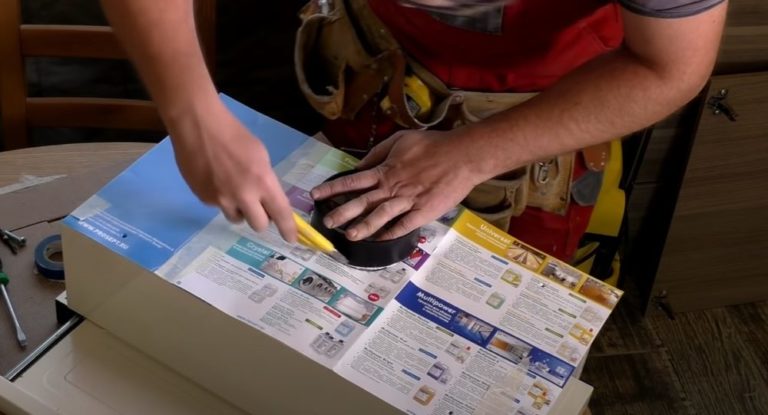 - Използвайте разгънати страници от вестник или списание, за да направите шаблон за маркиране на местата за канала и винтовете. Поставете хартията на дъното на абсорбатора. Използвайте нож, за да изрежете голям отвор за канала. Използвайте молив, за да пробиете дупки на местата за монтажните винтове.