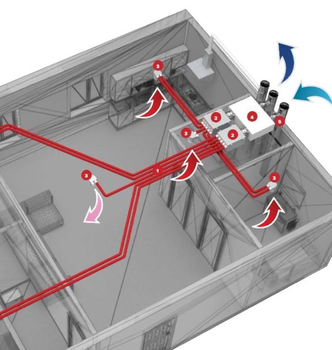 От оборудването до всяка стая са монтирани захранващи и изпускателни канали. Захранващите канали са разположени отдолу, а изпускателните - отгоре. Рекуператорът е оборудван със заглушител, за да се предотврати разпространението на звука от вентилатора в цялата къща.