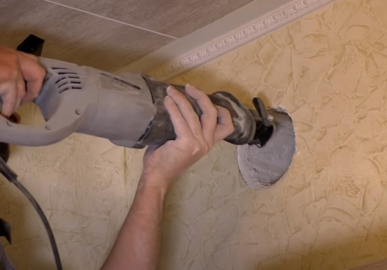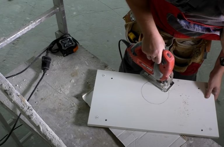 Проверете тръбата, за да се уверите, че преминава свободно през отвора. Освен това, маркирайте голям кръг с помощта на шаблона и го изрежете в покрива на шкафа за изхода на въздуховода.
