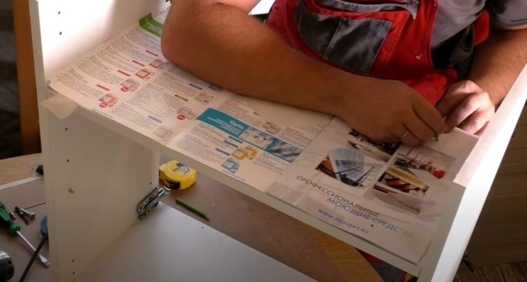 - Използвайте демонтираната основа на шкафа, за да направите рафт. Използвайте шаблона, за да маркирате отворите за канала и винтовете.
