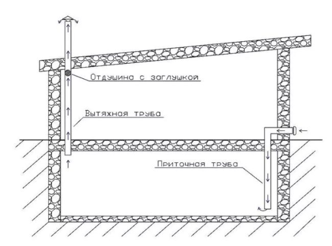 - Мазе или изба под къщата. За вентилация на мазето се монтира захранваща тръба. Единият край се простира на 20-30 см над нивото на земята близо до основата. Другият край се простира до пода на мазето, оставяйки разстояние от приблизително 20 см. Изпускателният канал се простира през тавана и покрива навън. Под тавана се оставя надвес от 10-20 см. Каналът може да се свърже с общия изпускателен канал на сградата.