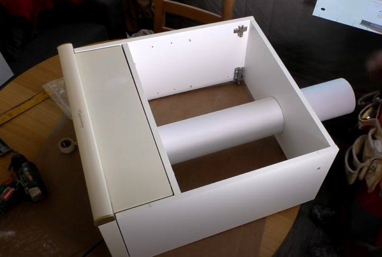 - Монтирайте абсорбатора и рафта в корпуса на шкафа. Закрепете частите с винтове. Поставете тръбата през подготвените отвори и я свържете към изхода за отвеждане на въздуха на абсорбатора.