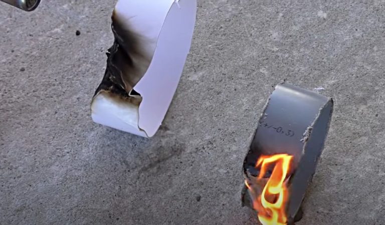 Тествайте огнеустойчивостта им, като запалите две парчета от материала с газова горелка. Пръстенът на белия въздуховод се топи, но изгасва. Секцията от сивата водопроводна тръба се топи и изгаря.