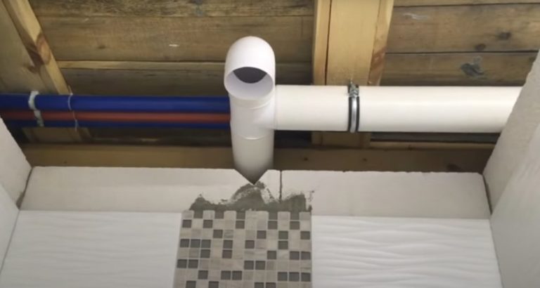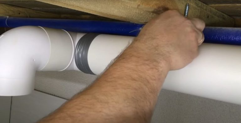 - Прикрепете предварително сглобена PVC тръба и фитинги към тавана. Използвайте скоби, за да закрепите тръбата. Свържете тръбата към муфата, излизаща от стената.