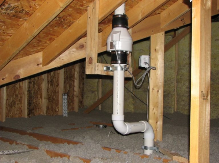 Монтирайте вентилаторите в колената на канала и ги закрепете със скоби и монтажни елементи. Свържете окабеляването и тествайте абсорбаторите. Всеки вентилатор ще работи независимо, отстранявайки застоялия въздух от тоалетната и душа през един канал.