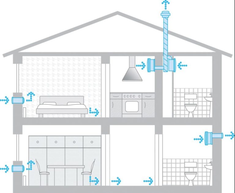 Изпусканият мръсен въздух се изпуска навън през кухненския абсорбатор, комина на бойлера, отворени прозорци или специално проектирани вентилационни отвори с клапани.