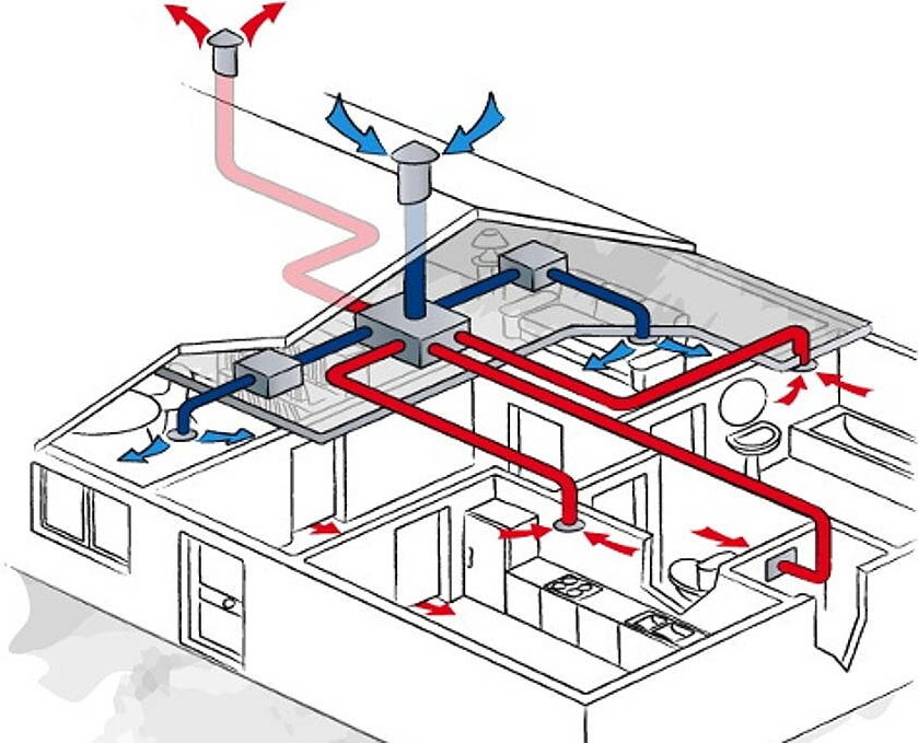В целогодишно живеещ дом е най-добре да се инсталира система за принудително подаване и изсмукване на въздух с рекуператор на топлина. В летни вили и сезонни имоти можете да инсталирате система за естествено, смесено, принудително отвеждане или подаване на въздух.