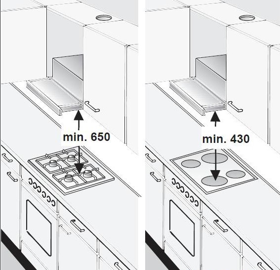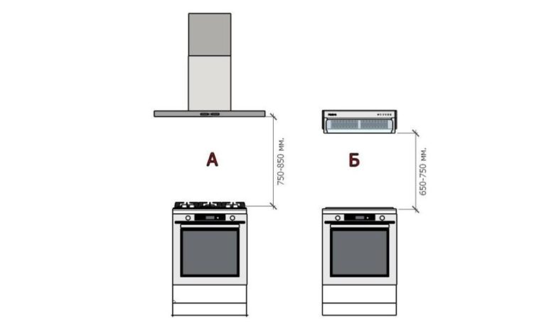 Височина на монтаж на абсорбатора над газовата и електрическата печка