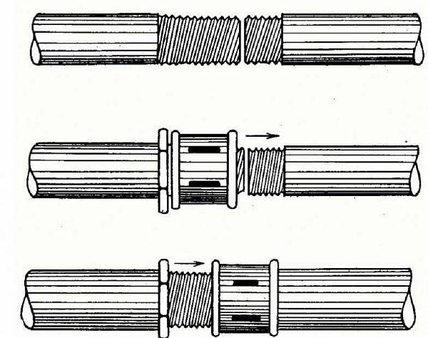 - Съединител. Този метод позволява създаването на херметични и надеждни конструкции на отоплителната тръба. Как да свържете съединителя, можете да намерите в описанието по-горе.