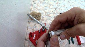 - Парче кълчища, напоено със смазка, се завинтва върху нарязаните резби. За всички тези стъпки е необходим регулируем гаечен ключ.