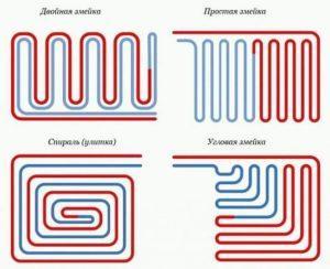 - Цялата повърхност се полага по подобен начин. Тръбите за подово отопление могат да се полагат по различни схеми. Показаните по-долу опции варират по топлинна мощност, експлоатационна ефективност и сложност на „направи си сам“ монтажа.
