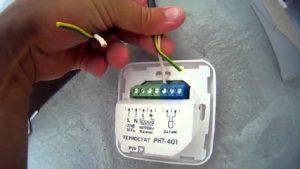 - Свързване на термостата. Устройството за контрол на температурата често се продава заедно с термостата. Устройството се монтира под термофилма и се закрепва с изолатор към графитната лента на нагревателния елемент. За да се осигури равна повърхност на пода, в топлоотразяващия слой се прави специален отвор за сензора, проводника и скобите. След прокарване на проводниците през подготвените канали, те се закрепват с тиксо.