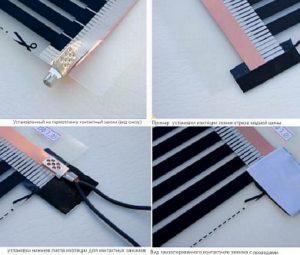 - Свързване на термофилмото. За да свържете системата, поставете един или няколко проводника в скобата, в зависимост от дизайна на контактните скоби. Контактът се компресира, за да се закрепи проводникът в скобата. След това всички контакти се изолират. Един слой битумна изолация се полага върху зоната на свързване, а друг отдолу. Изолационните ленти също трябва да бъдат плътно залепени една за друга.