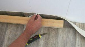 - Поставете линолеума. Рулото от подова настилка се развива върху цялата площ на стаята. Оставете линолеума да изсъхне няколко дни, преди да го залепите и да монтирате первазите.