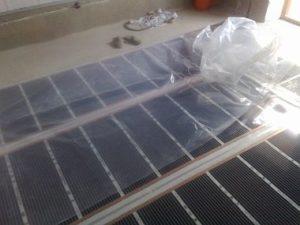 - Хидроизолация. По цялата повърхност на инфрачервения под се полага полиетиленово фолио. То се припокрива със 100 мм и се закрепва с тиксо на няколко места.