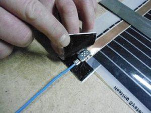 - Монтаж на температурен сензор. Той е прикрепен към долната част на фолиото, към черната лента, на 150 мм от ръба на фолиото. Закрепва се с монтажна лента. Самият сензор и неговият проводник се поставят във фолийната изолация, за да се създаде равна повърхност. За да се постигне това, в изолацията се изрязват канали за сензора, клемите и проводниците. Проводниците и сензорът се поставят във фолийната изолация и се закрепват с лента.