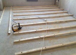 - Дървените греди се полагат и закрепват към основата на пода с самонарезни винтове.