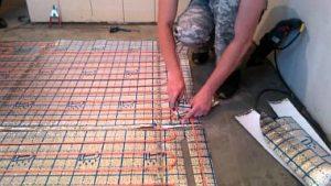 - Нагревателните елементи се полагат върху мрежата според планираното разположение. В пресечните точки на кабела и гредата трябва да се направят малки разрези.