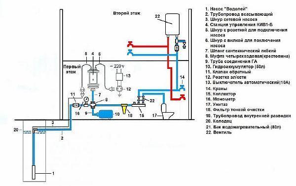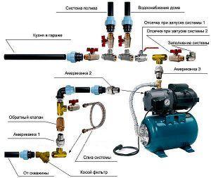 Монтажът на пластмасова водопроводна система за селска къща се извършва по следния начин. В този случай водата се подава през помпа, който доставя течност от резервоар за съхранение или хидравличен акумулатор.