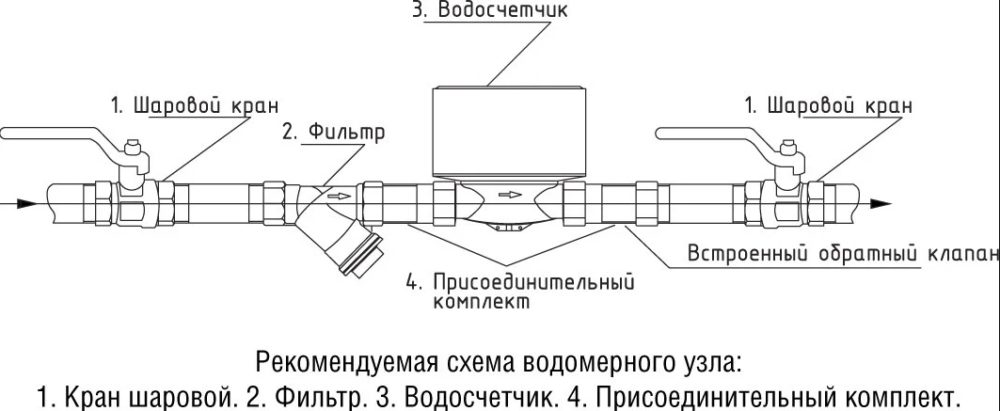 Водата трябва да постъпва в него през филтър (2). Водомерът (1) е свързан към тръбопроводната система чрез съединител (3). В точките на свързване на този уред към тръбопровода са монтирани спирателни сферични кранове, за да се гарантира, че вътрешната тръбопроводна система може да бъде изключена, ако са необходими ремонти или подмяна, без да се изключва щрангът.