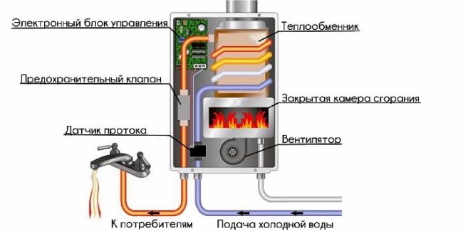 В началното си положение, газовият пилот гори непрекъснато. Когато кранът се завърти, водата от водопровода отваря клапана и газът постъпва в решетката, където се запалва от пилотната лампа. Различните модели имат ръчен или автоматичен контрол на температурата на водата. Във всички модели обаче, автоматичен спирателен клапан изключва подаването на газ, ако подаването на вода внезапно се прекъсне.