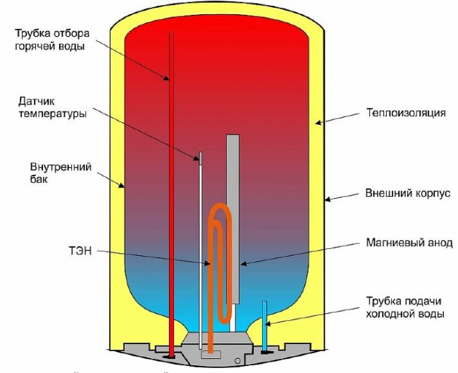 Резервоарът е оборудван с термостат, който контролира нагревателните елементи, поддържайки постоянна температура на работния обем вода (около 700 В.). Например, за семейство от пет души е достатъчен бойлер с резервоар от 50 литра. Предлагат се и модели с вместимост от 150 литра.