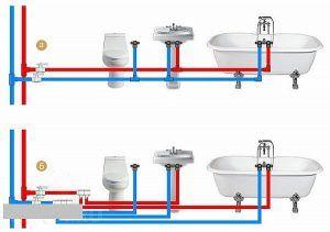 Паралелната система за водоснабдяване (виж фиг. b) е по-скъпа поради по-голямата дължина на тръбите и необходимостта от колектор. Въпреки това, налягането е равномерно по цялата линия и не е необходимо да се изключват всички уреди по време на ремонти.