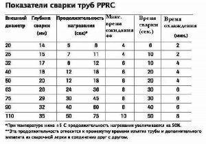 - Елементите се натискат върху втулката на поялника до зададения лимит. Фитингите, които не отговарят на зададените параметри, се бракуват незабавно, тъй като няма да се осигури солидна връзка. Нагряването на съвместимите части трябва да се извършва едновременно. Времето за топене, задържане и охлаждане може да варира в зависимост от диаметъра на пластмасовата тръба и дълбочината на заварката. Таблицата по-долу предоставя необходимата информация.